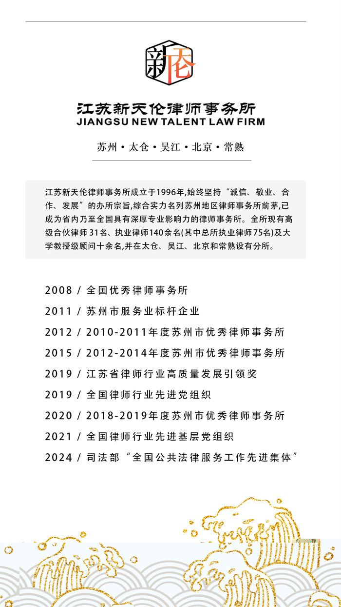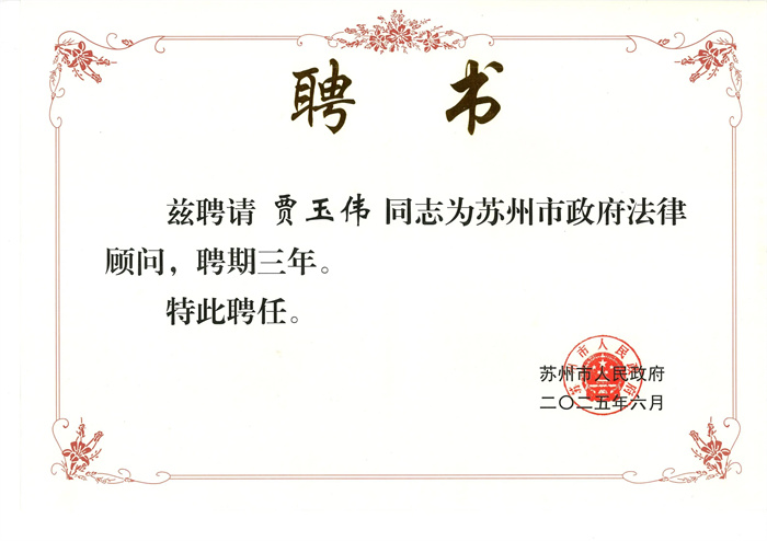 近日,苏州市政府公布了新一届市政府法律顾问名单,江苏新天伦(常熟)律师事务所贾玉伟律师被聘任为苏州市政府法律顾问,聘期3年。